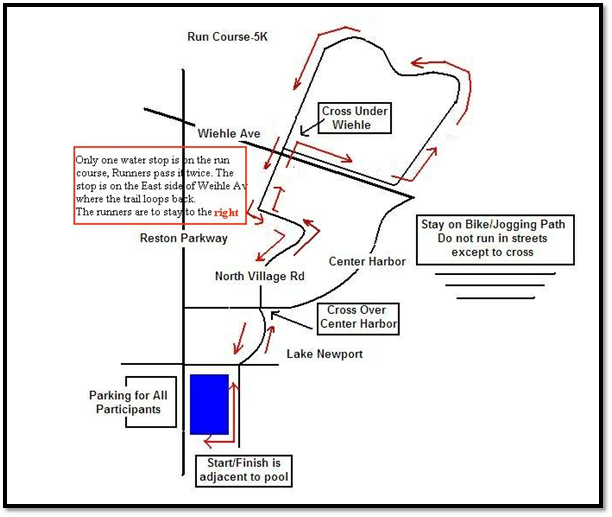 - Parking is available at Lake Newport Soccer Field (1533 Reston Parkway, Reston, VA) and North Point Village Center (1450 N Point Village Center, Reston, VA).